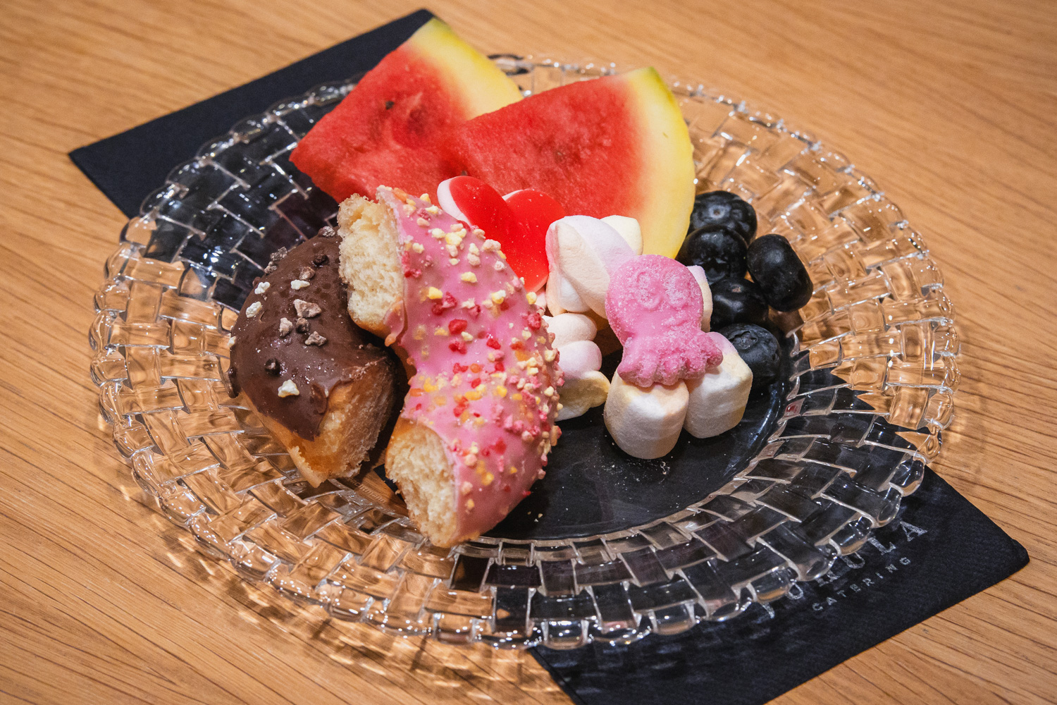 Sisältää donitsia, vaahtokarkkeja ja hedelmiä.