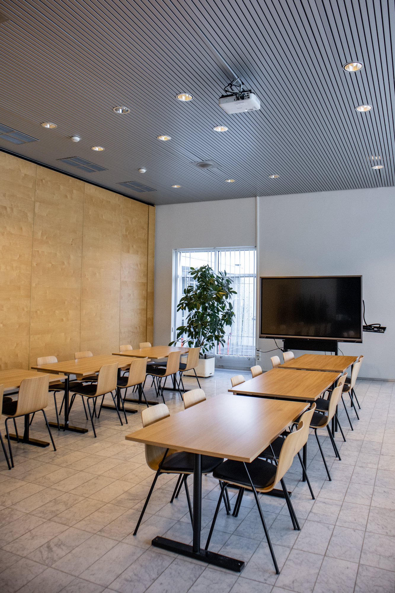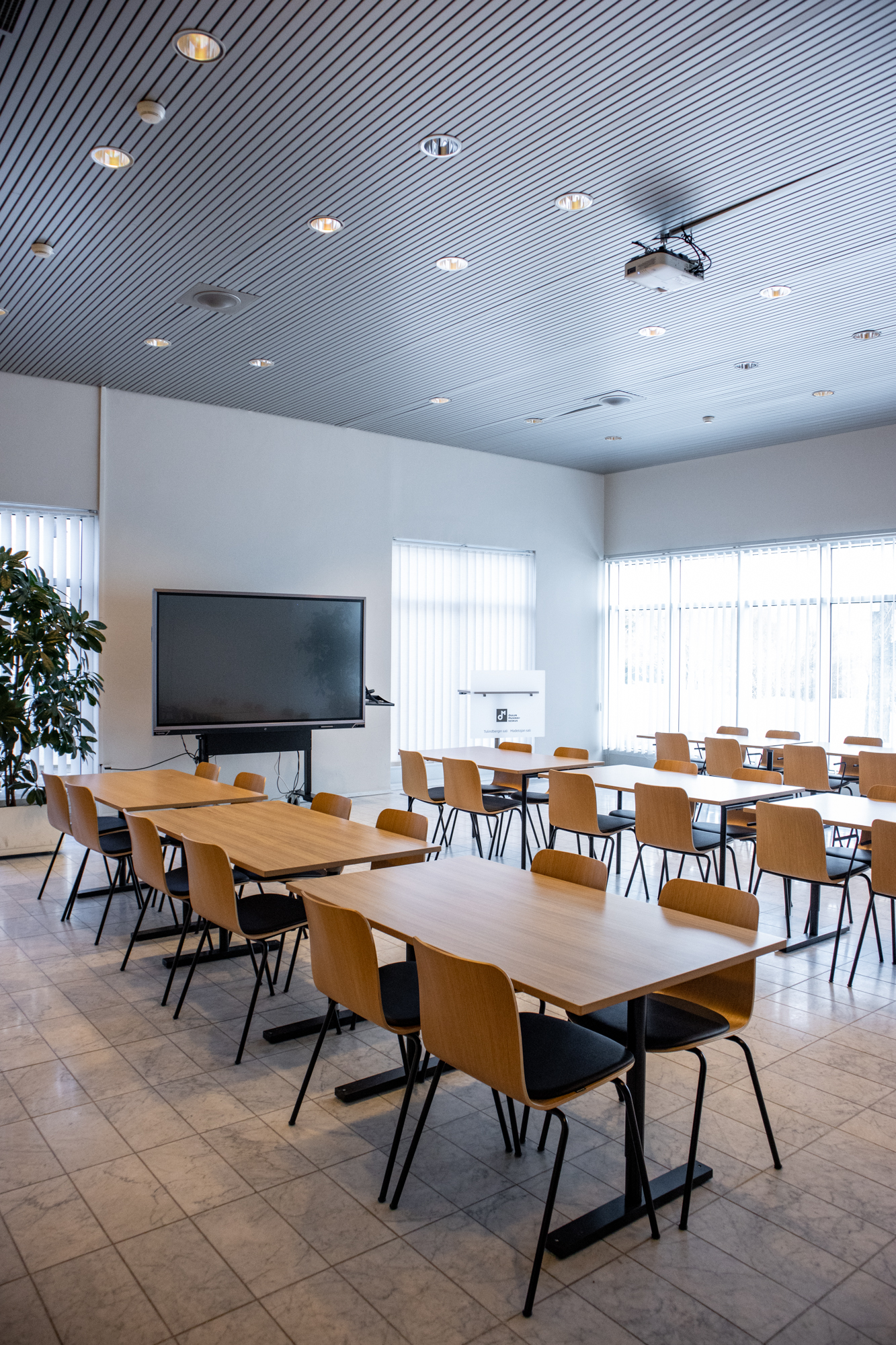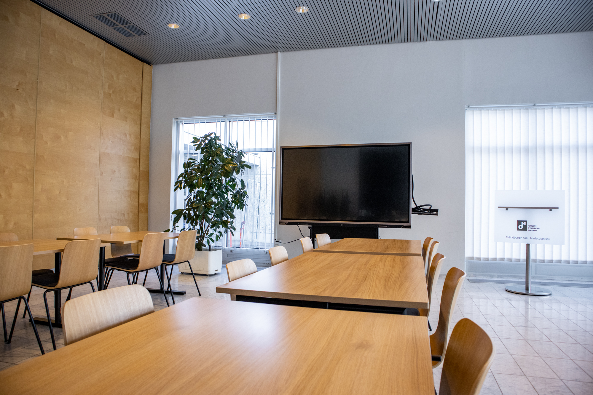 Kokoustilassa on siirreltävä iso TV-näyttö ja puhujanpöytä.